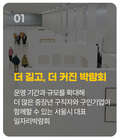 서울시 중장년 일자리박람회는 단순한 채용 박람회를 넘어, 중장년층이 다시 사회와 연결되고 자신에게 맞는 미래를 설계할 수 있도록 돕는 재도약 플랫폼입니다.