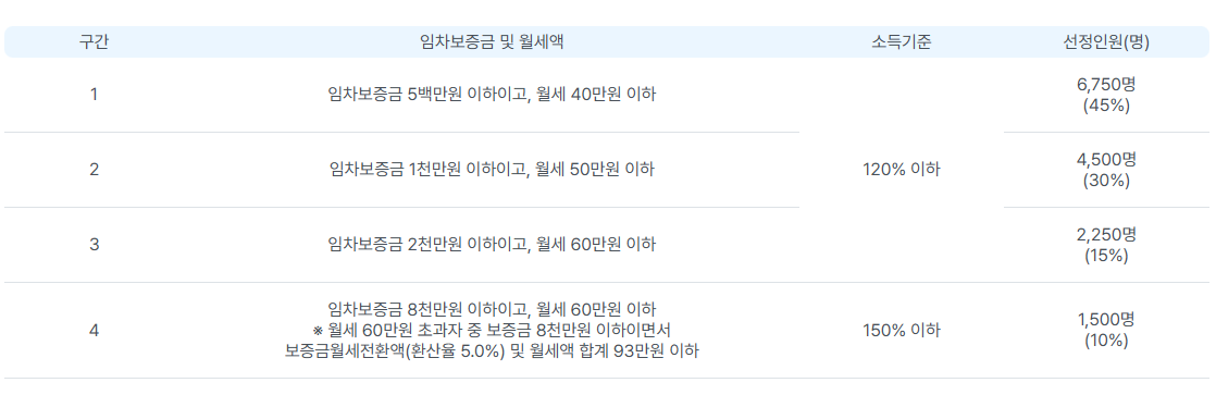 ㆍ 임차보증금, 월세 및 소득 기준 4개 구간으로 나누고 선정인원 초과 시 구간별 전산 무작위 추첨 / 15,000명