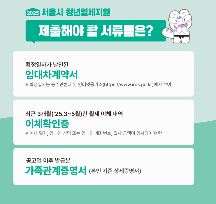 · 이체확인증 : 신청일 기준 최근 3개월(’25년3~5월)간 월세 이체 내역(임대인 계좌확인)(필수)